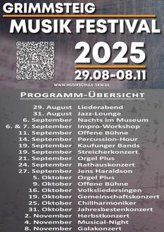 Auch dieses Jahr bietet das GrimmsteigMUSIKfestival vom 29.08. bis zum 08.11. eine Vielzahl musikalischer Events für jeden Geschmack. Von klassischen Konzerten über interaktive Mitmachaktionen bis hin zur entspannten Jazzlounge ist für alle Besucher etwas dabei.