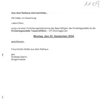 aufgrund einer Fortbildungsmaßnahme der Beschäftigten der Kindertagestätte ist die Kindertagesstätte Tausendfüßler — OT Dörnhagen am den 23. September 2024 Montag, geschlossen.