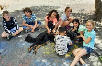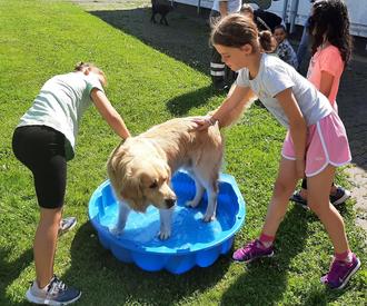 Dank unserer Koch-Ag machen wir ein großes Picknick auf dem Schulhof. Um bei den heißen Temperaturen für ein bisschen Abkühlung zu sorgen, baut die Hundestaffel einen Hundepool auf. Die Freude ist groß!!! Auch unsere Kinder haben unter einer Wasserfontäne aus dem Gartenschlauch ihre helle Freude. Ein johlen, rennen, lachen und spielen bestimmt unsere Mittagspause. Die Hunde sind natürlich immer mittendrin und werden mit Kuscheleinheiten verwöhnt.