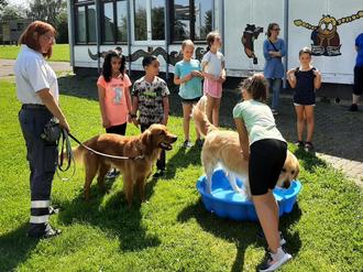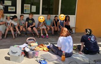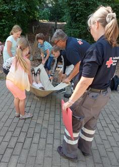 An einer anderen Station erfahren wir, was Hundeführer*innen bei einem Einsatz immer dabei haben, wie ein Einsatz abläuft, welche Dinge die Hunde anziehen und warum. Wir dürfen auch selber erste Hilfe Übungen machen und Kinder z. B. in eine Wärmedecke wickeln. Nach getaner Arbeit, dürfen wir auch dort den Hunden eine kleine Belohnung geben.