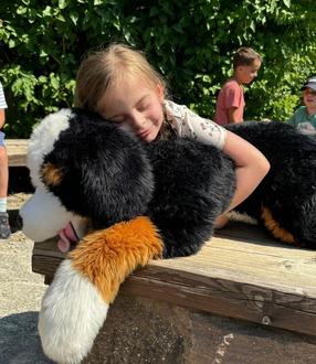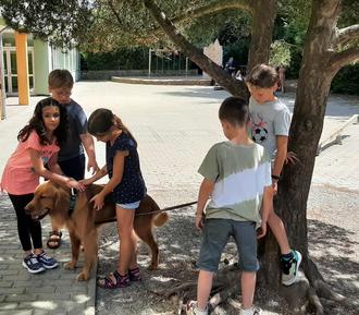 An einem lebensgroßen Hundestofftier können wir üben, wie man sich fremden Tieren gegenüber nähert. Wo darf ich den Hund streicheln? Wie Verhalte ich mich? Wie kann ich die Körpersprache des Hundes verstehen? Natürlich dürfen wir den Hunden auch ein Leckerli legen.