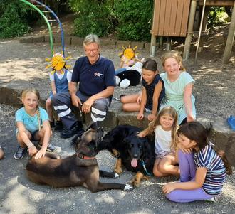 Und das sogar viel viel schneller als erwartet! Zum Abschluss treffen wir uns wieder an den Steintreppen. Wir bedanken uns ganz herzlich bei der Hundestaffel und die Kinder übergeben den Hunden ihre selbst gebastelten Spielzeugkraken, sowie den Erwachsenen einen Getränkebecher für zukünftige Einsätze. Die Hundestaffel hat für jedes Kind eine Urkunde dabei, welche unter tobenden Applaus überreicht wird. Zum Abschluss darf jedes Kind mit seinem Lieblingshund noch ein Foto machen.