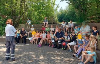 An der dritten Station lernen wir, was zu einer Ausbildung zum Rettungshund alles gehört. Wann man damit anfangen kann und wie lange eine Ausbildung dauert. Es gibt sogar eine richtige Abschlussprüfung. Der Vormittag geht wie im Flug vorbei und die Hundestaffel Kassel hat alle unsere Fragen spannend und kindgerecht beantworten können.
