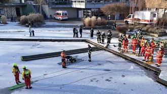 Im Anschluss verlegten die Einsatzkräfte zum Bürgersee, um das Gelernte praktisch umzusetzen. Dort waren die Einsatzkräfte zunächst damit beschäftigt, mit einer Kettensäge zwei Öffnungen in das Eis zu schneiden. Im hinteren Bereich des Gewässers erwies sich die Eisdecke als so dünn, dass einige Übungsteilnehmende in ihren Überlebensanzügen bewusst einbrachen – ein realitätsnahes Szenario, das unter kontrollierten Bedingungen wichtige Erfahrungen vermittelte.