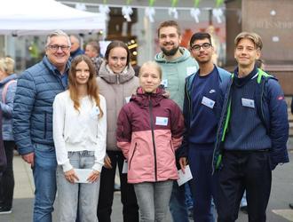 v.l.n.r.: Herr Hermes (Schulleiter), Lilith Udtke, Laura Bugiel, Marlene Albrecht, Herr Heitmann (Projektleiter, Lehrkraft), Hadiss Karimzadah und Janosch Bürgel