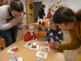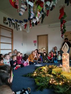 Im Turnraum war ein gemütlicher Sitzkreis aufgebaut, in dem mit Gitarrenbegleitung Weihnachtslieder gesungen wurden. Natürlich durfte hier auch nicht der Klassiker „In der Weihnachtsbäckerei“ von Rolf Zuckowski fehlen, bei dem die Kinder energisch mitsangen. Im Raum nebenan lud ein Bilderbuchtheater zum Staunen ein. Ein Programmpunkt, der alle zum Schmunzeln brachte, war die Fotostation, bei der die Kinder mit Weihnachtsbrillen und Co. ein Erinnerungsfoto machen konnten.