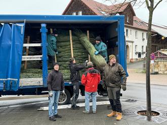 Tatkräftige Unterstützung beim Abladen und späteren Ausfahren der Weihnachtsbäume: Markus Imke, Hannes Imke und Daniel Fuchs, hier mit Gerhard Meil und dem Team der Gärtnerei Frese.