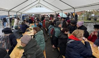 Bei der Planung des Adventsmarkts hatten zwar alle noch auf gutes Wetter gehofft, aber trotzdem schon die Notwendigkeit gesehen, bei Regenwetter genügend geschützte Plätze für die Gäste zu schaffen. Und so wurden am Vormittag gleich mehrere große Zelte aufgebaut und mit Tischen und Bänken ausgestattet sowie viele zusätzliche Pavillons und Marktschirme aufgestellt, unter denen man an Stehtischen im Trockenen seinen Glühwein trinken und sich mit Freunden und Bekannten treffen konnte.