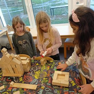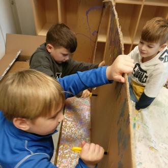 „In der ersten Woche hatten wir das Thema Kunst. Wir haben Feuerwerkbilder mit Pipetten gespritzt und auch große Bilder mit echten Spritzen gespritzt. Das hat uns viel Spaß gemacht. Wir haben auch aus alten Holzbausteinen kreative Gebäude gebaut. Zum Abschluss der Woche haben wir einen Mond aus Pappmarsche gestaltet. Er kann sogar leuchten.