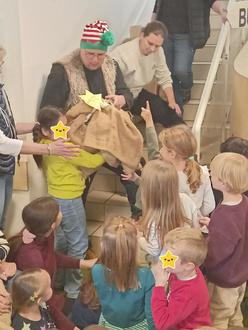 Er hatte für alle Gruppen und natürlich auch für die Schulkinder einen Sack gefüllt mit Geschenken dabei.
