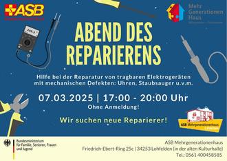 Die Stehlampe brennt nicht? Der Toaster ist kaputt? Die Uhr geht nicht richtig? Mit solchen Problemen sind Sie im Repariercafé des ASB-Mehrgenerationenhauses am Friedrich-Ebert-Ring 25c in Lohfelden genau richtig. Technisch versierte ehrenamtliche Helfer geben Hilfe zur Selbsthilfe, um defekte Geräte von der kleinen Saftpresse bis zum großen Staubsauger wieder zum Laufen zu bringen. Für Freitag, 7. März, lädt das Team von 17 bis 20 Uhr zu einem „Abend des Reparierens“ ein. Eine Anmeldung ist nicht erforderlich.