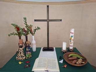Pfarrer Torben Scherf sprach mit der Gemeinde das Vaterunser. Tatkräftige Unterstützung erfuhren die Kirchenvorstände auch von den Landfrauen. Melanie Nöll sorgte für die Dekoration des Altars und kochte die nigerianischen Gerichte Jollof Reis und Schwarzaugenbohnen mit Kochbananen. Als Getränk servierte sie Zobo Drink, ein erfrischendes Getränk aus getrockneten Hibiskusblüten, das vor allem während festlicher Anlässe serviert wird. Irmgard England und Brigitte Heeger backten Kokosbällchen nach einem nigerianischen Rezept.