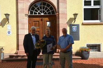 Bürgermeister Rainer Barth (links) und Direktor des Amtsgerichts Philipp Zmyj-Köbel (rechts) gratulieren Klaus Böse zu 60 Jahren Ehrenamt. (Autor und Fotograf: Philipp Knoch)