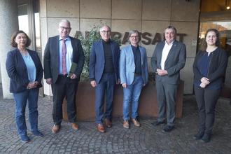 Schauten sich gemeinsam die Statistik an (v. l.): Cornelia Kazakob-Marsollek, Dr. Christian Pfeil, Staatssekretär Wolfgang Förster, Heinz Müller, Landrat Dr. Theophil Gallo und Carolin Bahm (ism).