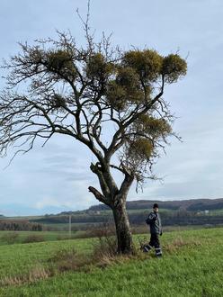 FÖJ’ler Tim Hülshoff kartiert mit einem GPS-Gerät den Mistelbefall