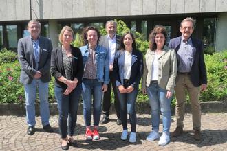 Stellvertretend für das große Team der Schulverwaltung mit den Schulsekretariaten und der Schulbuchausleihe kamen Simone Schmidt, Tanja Riefer, Barbara Stoffel und Marion Jahrmatter (vorne v. l.) zusammen – hier mit Fachbereichsleiter Jürgen Holzer (l.), Landrat Dr. Theophil Gallo (Mitte) und Hans-Peter Engel, Geschäftsbereichsleiter Finanzen, Immobilien und Schulverwaltung (r.).