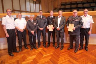 Landrat Dr. Theophil Gallo überreichte beiden Feuerwehrmehrmännern eine Urkunde und fand anerkennende Worte: „Die Jugendfeuerwehr-Wettbewerbe sind vielfältig und für die Entwicklung der jungen Kameradinnen und Kameraden in der Ausübung ihres anspruchsvollen Hobbys von großer Bedeutung. Das Ehrenamt des Fachbereichsleiters erfordert viel Zeit und Herzblut und ich danke Christoph Gillmann auch im Namen aller Kreistagsmitglieder ganz herzlich für sein herausragendes Engagement und sein zuverlässiges Arbeiten zum Wohle der Jugendfeuerwehr im Kreis. Kevin Birringer gilt ebenso unser Dank für die Übernahme dieses Amtes und wir wünschen ihm Freude und Erfolg bei der Organisation und Durchführung der Wettbewerbe.“