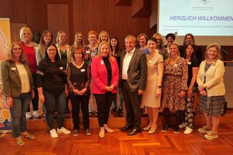 Bei der Abschlussveranstaltung im großen Sitzungssaal – hier mit Landrat Dr. Theophil Gallo, Bildungsministerin Christine Streichert-Clivot (1. Reihe 4. v. l.), Jelena Wagner (1. Reihe 4. v. r.) sowie den Vertreterinnen der Kitas.