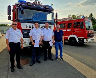 Auf dem Bild zu sehen sind: v.l.n.r.: Wehrführer Gunther Klein, stellvertretender Wehrführer Michael Klein, stellvertretender Wehrführer Thomas Keßler, Bürgermeister Frank John.