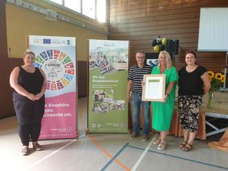 Freuen sich gemeinsam über die Auszeichnung: Ortsvorsteherin Ommersheim, Caroline Usner-Reinhard, stellv. Verbandsvorsteher, Frank John, Schulleiterin, Christina Linz, und Stefanie Lagaly vom Biosphärenzweckverband.