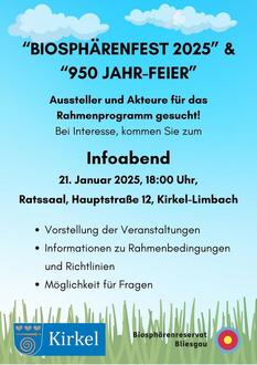 Alle Interessierten und Beteiligten sind herzlich zu dem 1. Informationsabend „Biosphärenfest 2025 + 950 Jahrfeier Kirkel-Neuhäusel“ am 21. Januar um 18.00 Uhr, im Ratssaal, Hauptstraße 12, in Kirkel-Limbach eingeladen.