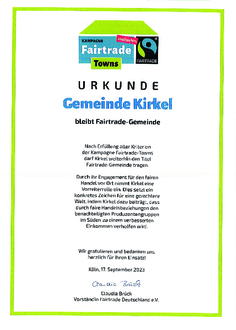 Die Gemeinde Kirkel erfüllt weiterhin alle fünf Kriterien der Fairtrade-Towns-Kampagne und trägt für weitere zwei Jahre den Titel Fairtrade-Gemeinde.