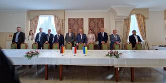 Die Teilnehmenden der Konferenz um Landrat Dr. Theophil Gallo (Mitte) und Landrat Zenon Swatek (5. v. r.) kurz vor Unterzeichnung der Erklärung zur Zusammenarbeit