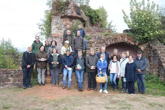 Nach dem fachlichen Austausch mit Katrin Thieser (vorne, Mitte rechts mit Korb) von der Saarpfalz-Touristik auf dem Schlossberg.