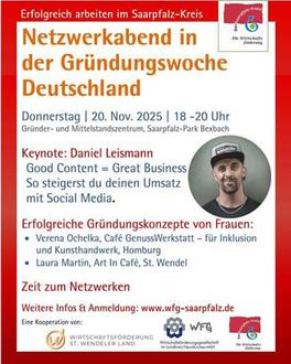 Die Veranstaltung ist ein gemeinsames Angebot der Wirtschaftsförderungen der Landkreise St. Wendel, Neunkirchen und des Saarpfalz-Kreises und der Netzwerkstelle Frauen im Beruf (FiB)/ Arbeitskammer des Saarlandes und richtet sich an Gründungsinteressierte und junge Unternehmen.