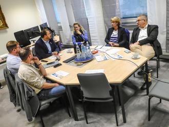 Kirkels Bauamtsleiter Fabian Keil, Sanierungsmanager Christian Ecker, Bürgermeister Dominik Hochlenert besprachen mit Eva-Maria Kiefer-Kremer und Ina Kunz – beide bei der KEW mit dem Thema Kommunale Wärmeplanung befasst – sowie KEW-Vorstand Marcel Dubois (von links) das weitere Vorgehen.