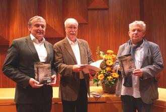 Landrat Dr. Theophil Gallo, Landrat a. D. Siegfried Wack und Martin Baus, M. A., halten das neue Jahrbuch in den Händen (v. l.).