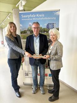 Landrat Frank John bei der Staffelübergabe mit neuer und aktueller Geschäftsführerin der Wirtschaftsförderungsgesellschaft Saarpfalz (WFG). Doris Gaa (rechts) verabschiedet sich nach mehr als drei Jahrzenten engagierter Wirtschaftsförderung zum Jahresende in den Ruhestand. Ab Januar 2026 übernimmt Alexandra Heß (links), die seit mehr als 21 Jahren bei der WFG in leitender Position tätig ist, die Geschäftsführung.