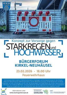 Doch auch unsere Bürger sind aufgefordert, sich aktiv an dieser Konzeptentwicklung zu beteiligen. Dazu wird es in jedem Ortsteil ein Bürgerforum geben, den Auftakt macht Kirkel-Neuhäusel am 23. Februar. Alle Infos finden sich im hier abgedruckten Flyer. Die zusätzlichen Karten sollen einen Überblick geben, welche Lagen bei einem hundertjährigen und bei einem zweihundertjährigen Hochwasser besonders betroffen sind. Dabei ist Lila die Farbe der erwartbar am stärksten gefährdeten Zonen.