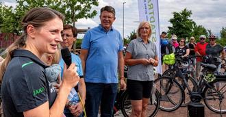Los ging es nach Feierabend am Bahnhof in Rohrbach. Hier hießen die Verwaltungsspitzen der drei Verbandsgemeinden Kathrin Flory, Torsten Blank und Hedi Braun nicht nur die Radlerinnen und Radler herzlich willkommen, sondern auch die mehrfache Bahnrad-Weltmeisterin und Olympiasiegerin Miriam Welte. „Ich freue mich, beim STADTRADELN dabei zu sein und fürs Radfahren zu werben! Auch wenn ich in meiner Sportlerkarriere nahezu 200.000 Kilometer im Sattel saß, nutze ich heute immer noch gerne das Rad zur Fortbewegung“, ermunterte die ehemalige Profisportlerin es ihr gleich zu tun und öfter vom Auto auf das Fahrrad umzusteigen.