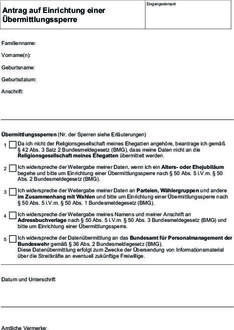 Mit Übermittlungssperren können Sie das Übermitteln Ihrer Meldedaten an bestimmte Institutionen ausschließen. Wenn Sie davon Gebrauch machen möchten, füllen Sie bitte nachfolgendes Formular aus und senden es an: