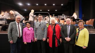Freuten sich gemeinsam über den gelungenen Konzertabend (v.l.n.r.): Bürgermeister Uwe Jäger, Erste Beigeordnete Bärbel Fehr, Leiter des Heeresmusikkorps Kassel, Tobias Terhardt, 1. Vorsitzende des Vereins Lohfelden hilft e.V., Ute Horbach, Kassierer von Lohfelden hilft, Dieter Eckert, sowie Schriftführerin Elke Herwig. Nicht auf dem Foto zu sehen ist der 2. Vorsitzende Görg Gauck.