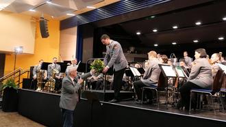 Bürgermeister Uwe Jäger übergab als Anerkennung einen Blumenstrauß an Dirigent Tobias Terhardt.