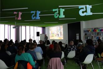 Am Samstagnachmittag öffnete die Bücherei die Türen. Um 15 Uhr lud der Illustrator und Autor Alexander Steffensmeier Groß und Klein ein, um in die Bücher rund um die Kuh Lieselotte einzutauchen. Er las aus dem ersten Lieselotte Buch „Liselotte lauert“ und aus dem zuletzt erschienen „Liselotte macht nicht mit“ vor. Er erzählte lustige Geschichten von Liselotte die zwischen Hühnern und Schweinen, als einzige Kuh auf einem Bauernhof lebt. Eins ihrer Hobbys ist das verfolgen des Postboten und mit der Erläuterung brachte Steffensmeier das Publikum zum Lachen und Grölen.