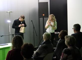 Herr Kliesch erhält für den unterhaltsamen Abend ein kleines Dankeschön, überreicht von der kommissarischen Büchereileitung Louisa Theis.