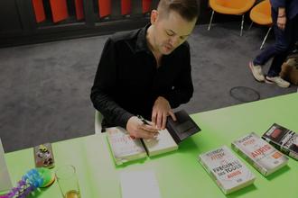 Um 19 Uhr stand dann das zweite Highlight des Tages an. Es folgte sodann die Lesung von Thriller Autor Vincent Kliesch. Er las aus dem 4. Teil seiner Reihe Auris „Der Klang des Bösen“. Die Reihe entstand in Zusammenarbeit und nach Idee von Sebastian Fitzek. In dem Thriller müssen Matthias Hegel und Jula Ansorge eine Wahrheit finden, die nur die Toten selbst zu kennen scheinen. Im Mittelpunkt des Buches steht der 15-jährige Silvan, der seine Mutter aus einem Fenster stürzen sieht. Für den Bruchteil einer Sekunde meint er, oben seinen Vater zu erkennen.