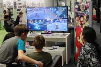Je vier Rennfahrerinnen und Rennfahrer lieferten sich ein Kopf-an-Kopf-Rennen beim Mario-Kart-Battle.