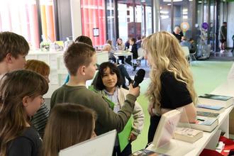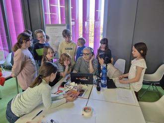 Podcasterin Lena Stenz erklärt den Kindern, die man eine Podcast-Folge herstellt und schneidet.