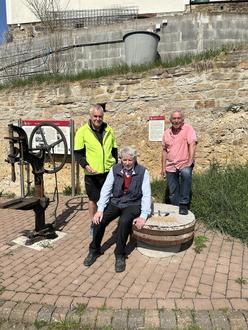 Geschichtswerkstattsprecher Herbert Brethauer und Volker Wagner bedanken sich bei Geschichtswerkstattsmitglied Horst Fehr (M.) für die Spende des Mühlsteins.