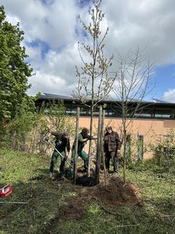 Die Roteiche wurde gesetzt und aufgerichtet.