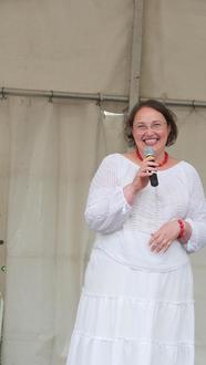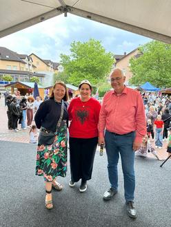 Die Vorsitzende des Lohfeldener Ausländerbeirates, Edita Basha (M.), gemeinsam mit Bürgermeister und Moderator Uwe Jäger (r.) und Moderatorin Ute Jäger (l.).