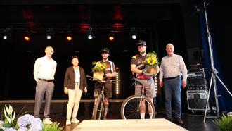 Danke auch an die Biker, auf dem Foto v.l.: Nick Spangenberg (U20-Vizeweltmeister 2022 Surfen, Disziplin „Wave”), Bärbel Fehr, (Erste Beigeordnete Gemeinde Lohfelden), Jan Salzmann, Tobias Nehler (Zweiter und Dritter der Norddeutschen Meisterschaften 2024 im Fahrradtrial, beide vom Team Bikes in Motion), Uwe Jäger (Bürgermeister Lohfelden).