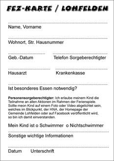Die Fez-Karte ist so etwas wie eine Identitätskarte für die Ferienspiele. Auf ihr stehen alle wichtigen Daten über das Kind. Sie ist sehr wichtig und muss jeden Tag mitgebracht werden. Bitte füllen Sie die Karte aus, unterschreiben sie und kleben sie dann am besten auf ein Stück Karton und machen eine Schnur dran, damit das Kind sie umhängen kann. So geht sie nicht verloren und hält vielleicht die ganze Fez-Zeit durch. Die Fez Karte und alle wichtigen Informationen finden Sie auch in den neuen Flyern, die in den Geschäften ausliegen. Zudem wird die Karte im Söhrewaldboten mehrfach veröffentlicht und kann problemlos ausgeschnitten und ausgefüllt werden.