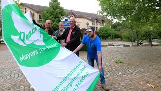 Bürgermeister Uwe Jäger (2.v.r.) hisste am 8. Juli die Flagge des Bündnisses „Mayors for Peace“.