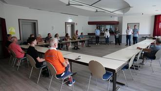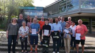 Die Teilnehmerinnen und Teilnehmer der Abschlussveranstaltung am 8. Juli im Familienraum am Bürgerhaus, darunter (v.l.n.r.): Radfahrbeauftragter Simon Dölle, Erste Beigeordnete Bärbel Fehr, Klimaschutzmanagerin Ursula Paul, Bürgermeister Uwe Jäger und Schulleiter Arno Scheinost.