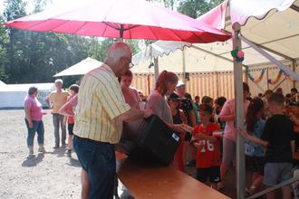 Nachdem die Gäste zusammen mit den Kindern und deren Betreuenden Kartoffelpuffer mit Apfelmus zu Mittag gegessen hatten, ging es daran, das Eis zu verteilen. Begeistert vernaschten die Mädchen und Jungen ihr erfrischendes Mitbringsel und riefen zum Dank den typischen FEZ-Spruch: „Das war Spitze und wir sagen Danke!“.